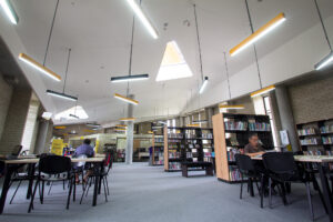 Su interior alberga dos salas de lectura -una para adultos y otra para niños y jóvenes- una sala de cómputo y una galería para exposiciones.
